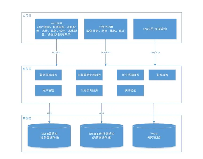 - 再往上的架构就是标准的MVC架构:应用层调用服务层获取到数据层(TDengine时序数据库)中设备的统计及分析数据,并返回进行展示和操作;