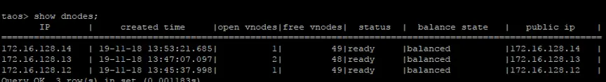 仿照上述操作配置第三台服务器后,通过show dnodes命令可查询配置的集群节点如下: