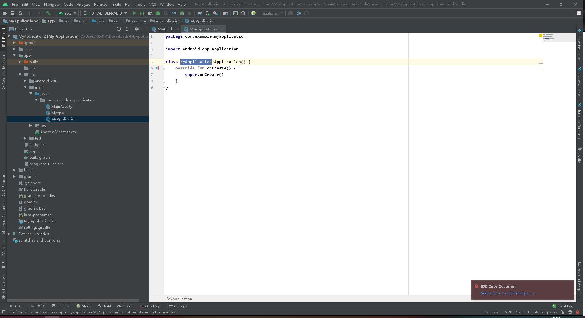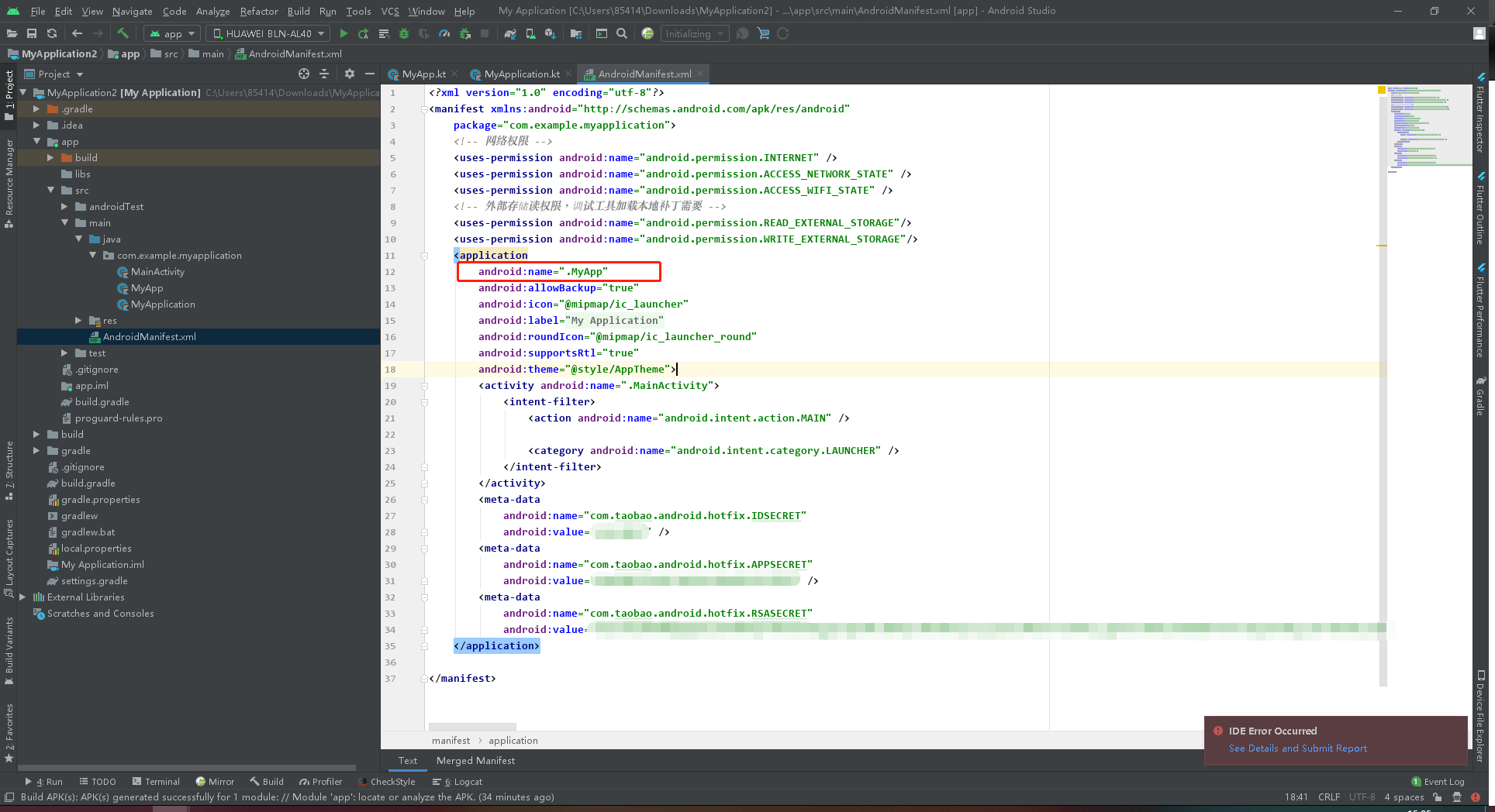 在清单文件里配置的是继承SophixApplication的MyApp,不是继承Application的MyApplication----看清楚