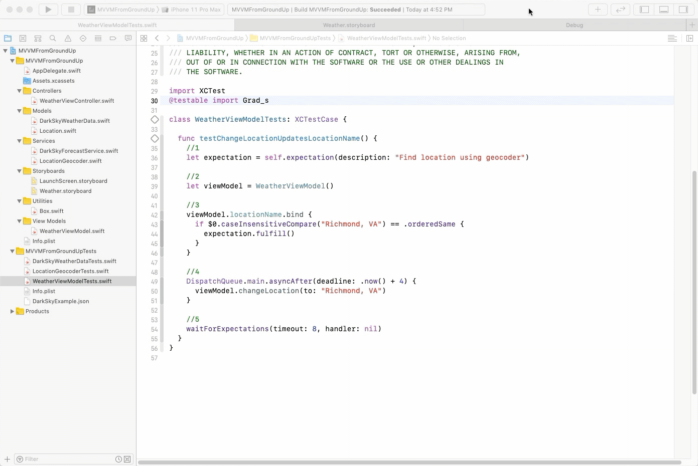 为了了解MVVM使测试视图模型更加简单,您将创建一个测试WeatherViewModel更改位置,然后确认locationName将更新绑定到预期位置。