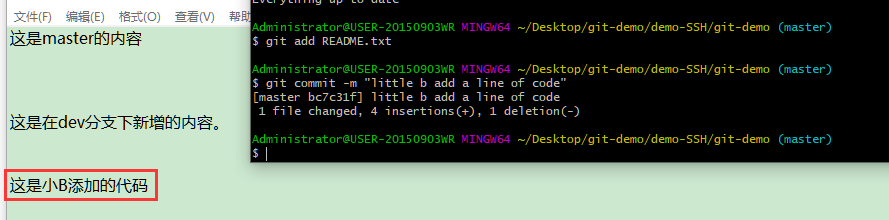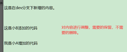 - 打开冲突文件,解决冲突 解决方法:小B跟小A(谁先提交的)进行商量,看代码如何保留,将改好的文件重新提交即可。