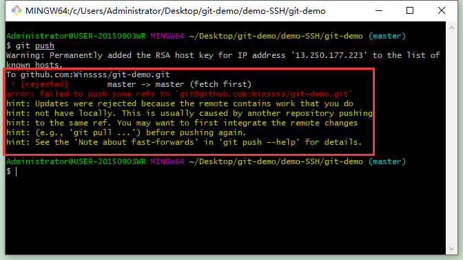 注意:黄色提示线上仓库有数据变动,提交代码前首先将线上仓库和线下仓库同步一下 即git pull