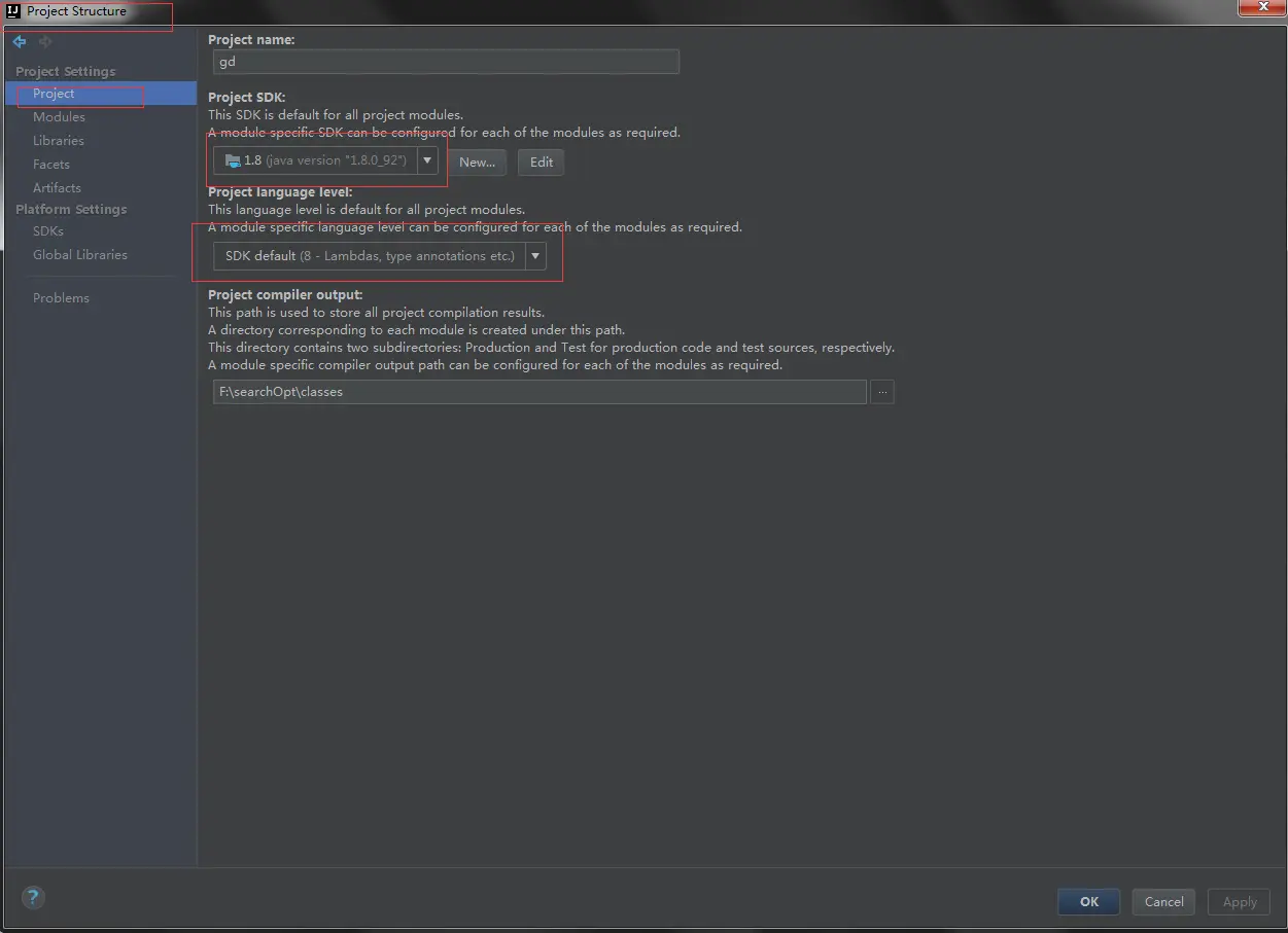 3,"ctrl+shift+alt+s" , 打开project settings,确定项目的jdk和sdk是是否配置正确: