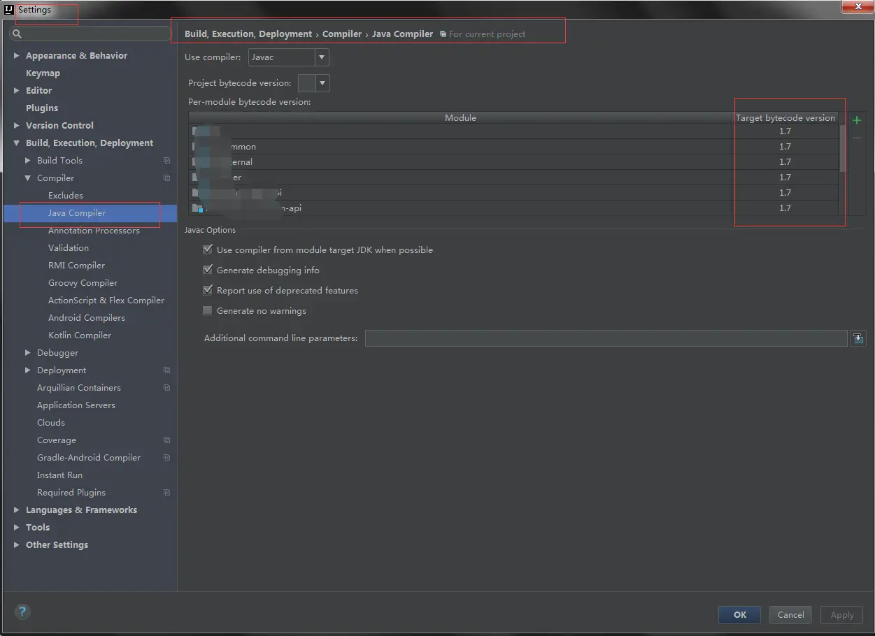 5 , 按下 "ctrl + alt + s " 打开settings确定Java compiler 的 Target bytecode version 是否选中项目需要的jdk版本: