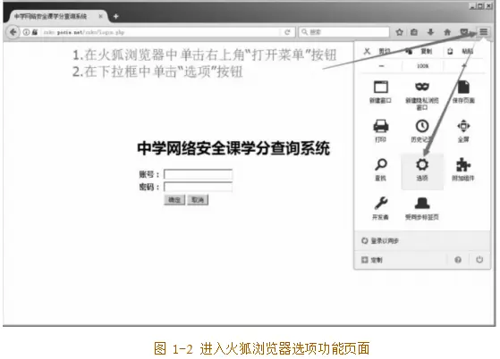 - (1)打开火狐浏览器,在页面中单击右上角的“打开菜单”按钮,然后在下拉框中单击“选项”按钮进入火狐浏览器选项页面,如图 1-2 所示。
