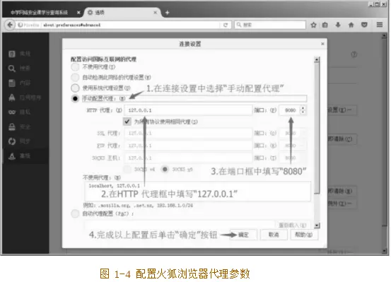 使用手工或工具对系统登录认证的账号及密码进行穷举访问测试,根据系统返回的数 据信息来判别账号及密码是否正确。测试流程如图 1-1 所示。 步骤一:对浏览器进行 HTTP 代理配置,将浏览器访问请求指向 Burp Suite 工具默认的监听端口(这里以火狐浏览器为例)。
