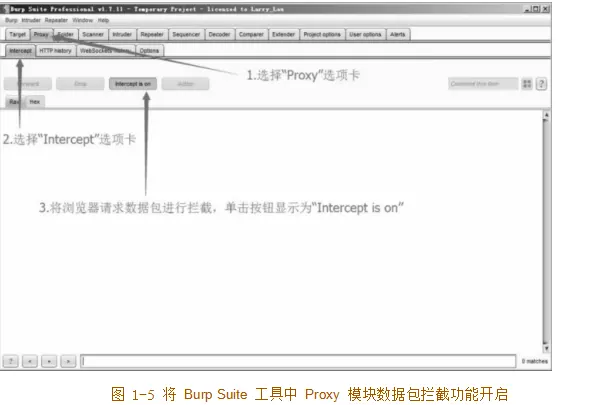 - (1)在 Burp Suite 页面中选择“Proxy”选项卡,然后再次选择“Intercept”子选项卡,在该选项卡界面中将“Intercept”按钮设置为“Intercept is on”,此时火狐浏览器发送的请求数据会被 Burp Suite 工具截断,如图1.5所示