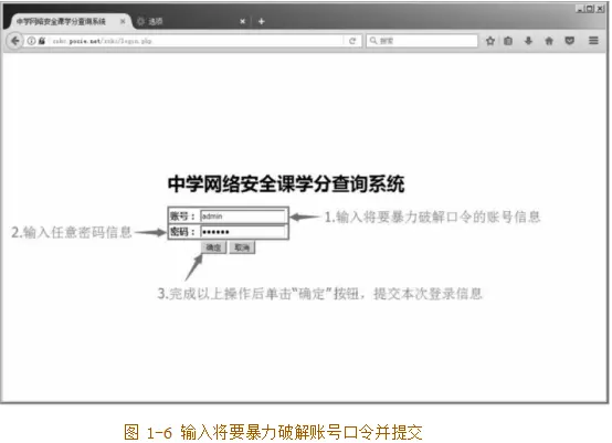 - (2)在火狐浏览器中填写要暴力破解的账号信息及任意 密码信息,单击“确定”按钮提交信息,如图1-6所示。