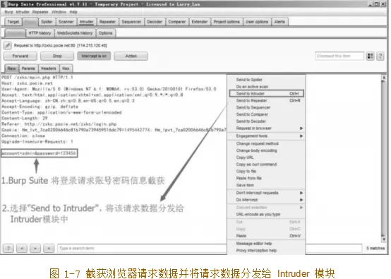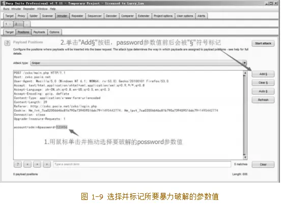 (2)用鼠标选中请求数据页面中的 password 参数值(所要进行暴力破解的密码值),并单击“Add §”按钮进行位置标记,如图 1-9 所示。