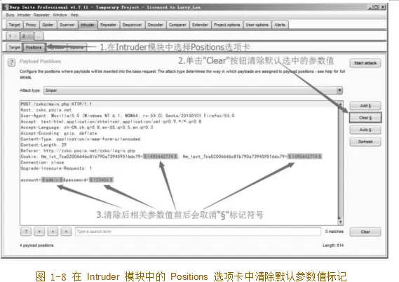 (1)在 Intruder 模块中选择 Positions 选项卡,单击“Clear”按钮清除相关默认参数值前后的“§”标记符号,如图1-8所示。