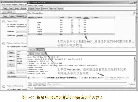 - (4)在暴力破解测试窗口“Intruder attack 1”中可根据 Length 属性值长度的不同来判断暴力破解密码是否成功,也可通过查看 Response 返回信息或者 Status 返回状态的不同来判断破解密码是否成功,如图1-11所示。