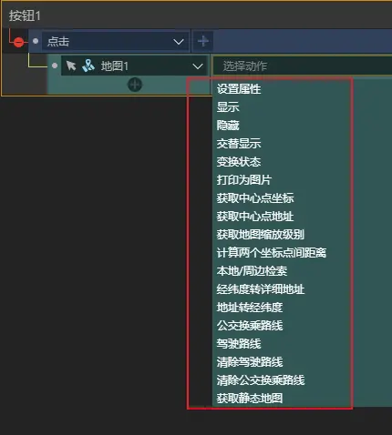 3.选中一个地图标记后,我们就将这个标记的经纬度坐标保存到文本变量中,调用动作组1。在动作组中地图组件会计算当前位置到选中位置的行驶路线并显示在地图上,这样一个简易的搜索导航功能就完成了。
