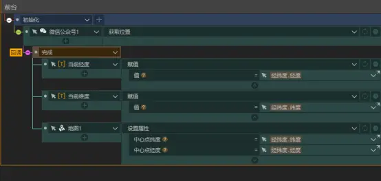 1.首先需要给案例添加了一个微信公众号组件,在前台初始化时,我们会让微信公众号组件获取当前用户的位置的经纬度坐标,将其保存到文本变量中并设置地图组件的中心点为该坐标,这样打开案例后地图组件显示的区域就是用户当前所在地附近。