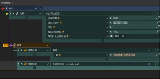 2.然后是用户输入搜索地址,当点击搜索图标时(实际上点击到的是透明按钮),地图组件会对本地周边进行一个检索,将检索的相关结果保存在对象数组“搜索结果”中。