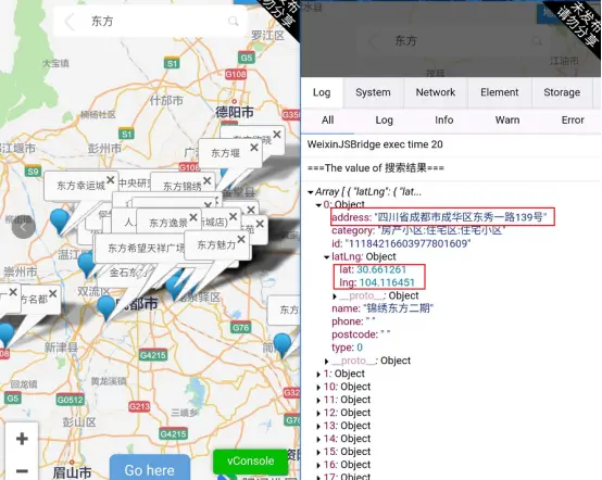这里我们可以将“搜索结果”打印出来看一下,其中包括每个地点的地址和经纬度坐标,我们通过for容器循环创建将标记点都显示在地图上。