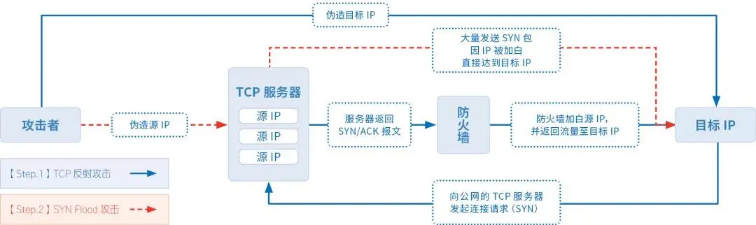 Ø 结合TCP反射攻击可以将反射服务器IP加入DDoS防火墙白名单的特性,绕过防守后,伪装反射服务器IP,发起大规模SYN Flood攻击,直击后端服务器;