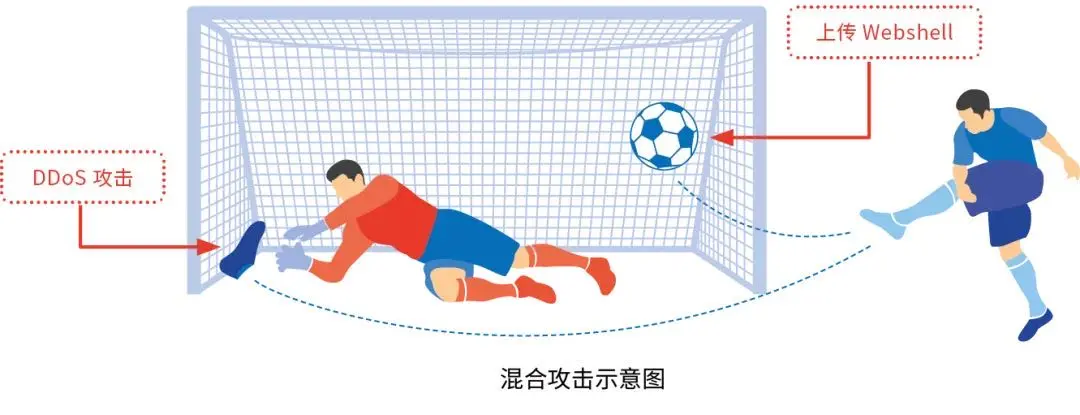 Ø Web应用攻击+DDoS攻击的组合,让防御方疲于应对DDoS攻击,使Web应用攻击绕过防守主力,达到最终的攻击目的;