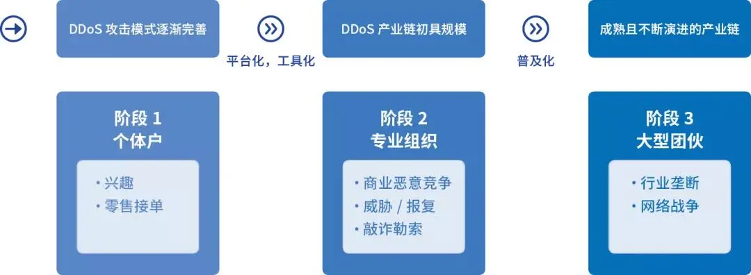 同时出现集成自动化的DDoS攻击软件、平台化的SaaS服务。且逐渐团伙化发展,形成DDoS完整攻击链闭环。