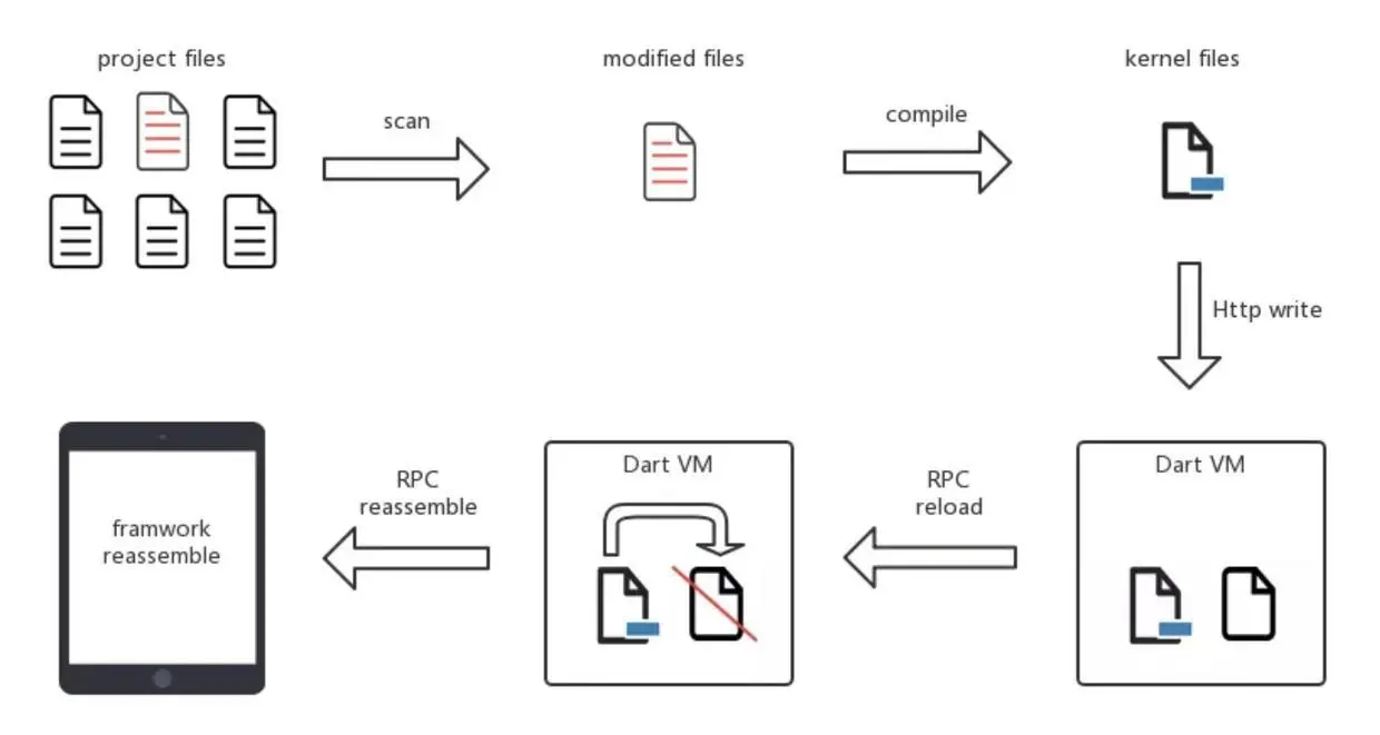 Flutter支持AOT(Ahead of time)和JIT(Just in time)两种编译模式,JIT模式支持在运行过程中进行Hot Reload。刷新过程是一个增量的过程,由系统对本次和上次的代码做一次snapshot,将新的代码注入到DartVM中进行刷新。但有时会不能进行Hot Reload,此时进行一次全量的Hot Reload即可。而AOT模式则是在运行前预先编译好,这样在每次运行过程中就不需要进行分析、编译,此模式的运行速度是最快的。Flutter同时采用了两种方案,在开发阶段采用JIT模式进行开发,在release阶段采用AOT模式,将代码打包为二进制进行发布。