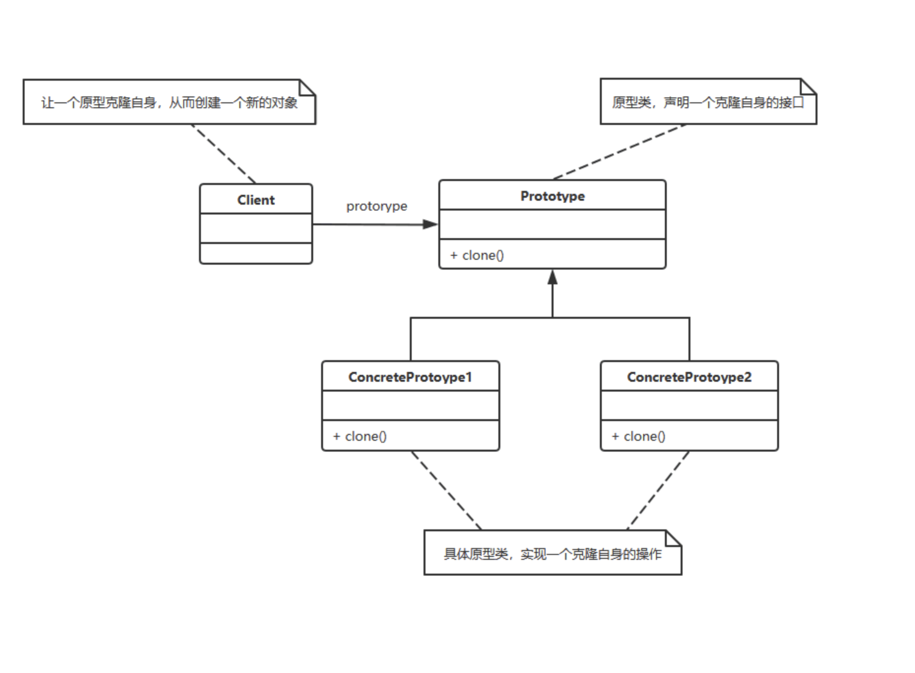 Prototype:抽象原型类。声明克隆自身的接口。