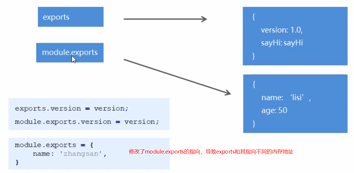 exports是module.exports的别名,在内存中指向的是同一块内存地址,最终导出的以module.exports为准。当module.exports导出的是对象的时候,require导入的也是由module.exports导出的对象。