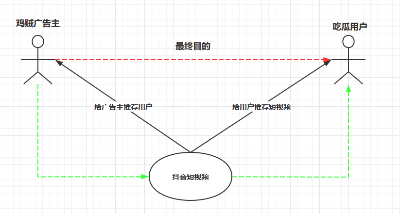 通过下面一张图说明鸡贼广告主、吃瓜用户和抖音平台三者之间的关系:
