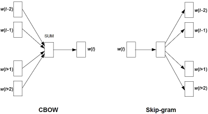 Word2vec中有两种模型结构:CBOW和Skip-gram。CBOW就是通过上下文的词来预测当前词,非常好理解的一个方式就是我们小时候英语考试中的完形填空。给你一段话,中间抠去几个词,然后让你按照上下文来预测抠掉的这几个词。而另外一种Skip-gram则刚好相反,是根据当前的词来预测上下文的词,比较抽象,就不举例子了。CBOW和Skip-gram结构如下图所示: