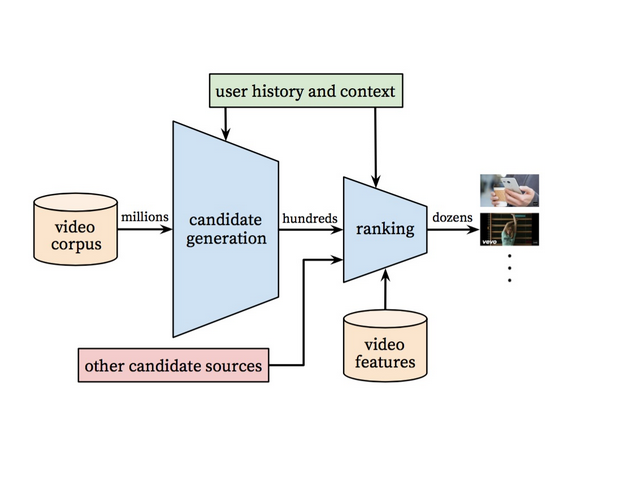 关于业务方面还需要说明的是模型优化目标的确定。Youtube推荐系统将用户观看时间作为模型优化的目标,这是同时从模型和商业的角度分析得到的结果。模型方面需要反映用户真实的兴趣,选择观看时间比点击率或者播放率可能更有效。有时候用户虽然点了视频,但是可能看了两秒觉得没啥意思,这时如果把点击率当做评价指标,这条样本就是正例,但实际情况是用户可能对这条视频没啥兴趣。但是如果选择观看时间则能进一步反应用户兴趣,能在没兴趣的前提下坚持把视频看完是少之又少的。所以这里给咱们机器学习工程师的参考意义是开发模型的时候要深入到业务中,毕竟模型最终是服务于业务的。明确模型要优化的目标是成功的一半。