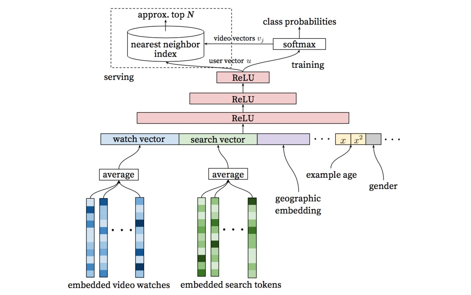 经过Softmax之后我们得到了视频向量Video Vector。这里又有个工程上的问题,为啥要采用最近邻搜索算法来选择百级别的视频?这里则是从工程和学术的角度做权衡之后的结果。如果直接使用训练时的模型去预测百万级别的候选集,模型的时间开销太大。一个不错的选择是我们通过模型分别得到User Embedding和VideoEmbedding之后,通过最近邻搜索的方法可以大幅度提升效率。工业中一般是将User Embedding和Video Embedding存储到Redis这一类内存数据库中。