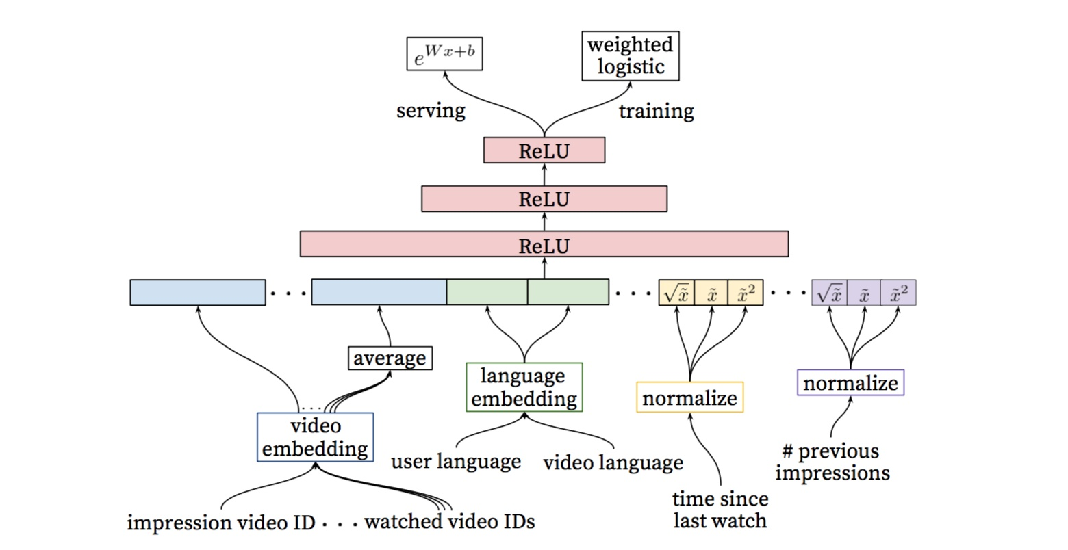 下面还是同样的操作,将这些特征进行拼接之后喂给模型。后面跟了三层Relu神经网络。然后使用了带权重的逻辑回归函数Weighted Logistic Regression作为输出层。这里使用带权重的逻辑函数主要原因是模型使用了视频预期观看时间作为优化目标,可以把观看时间作为正样本的权重,在提供线上服务的时候通过e(Wx+b)做预测得到期望观看时间的近似。