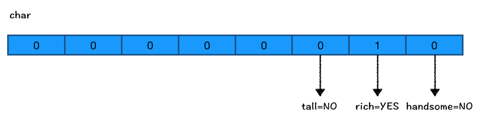 例如_tallRichHansome的值为 0b 0000 0010 ,那么只使用8个二进制位中的最后3个,分别为其赋值0或者1来代表tall、rich、handsome的值。如下图所示