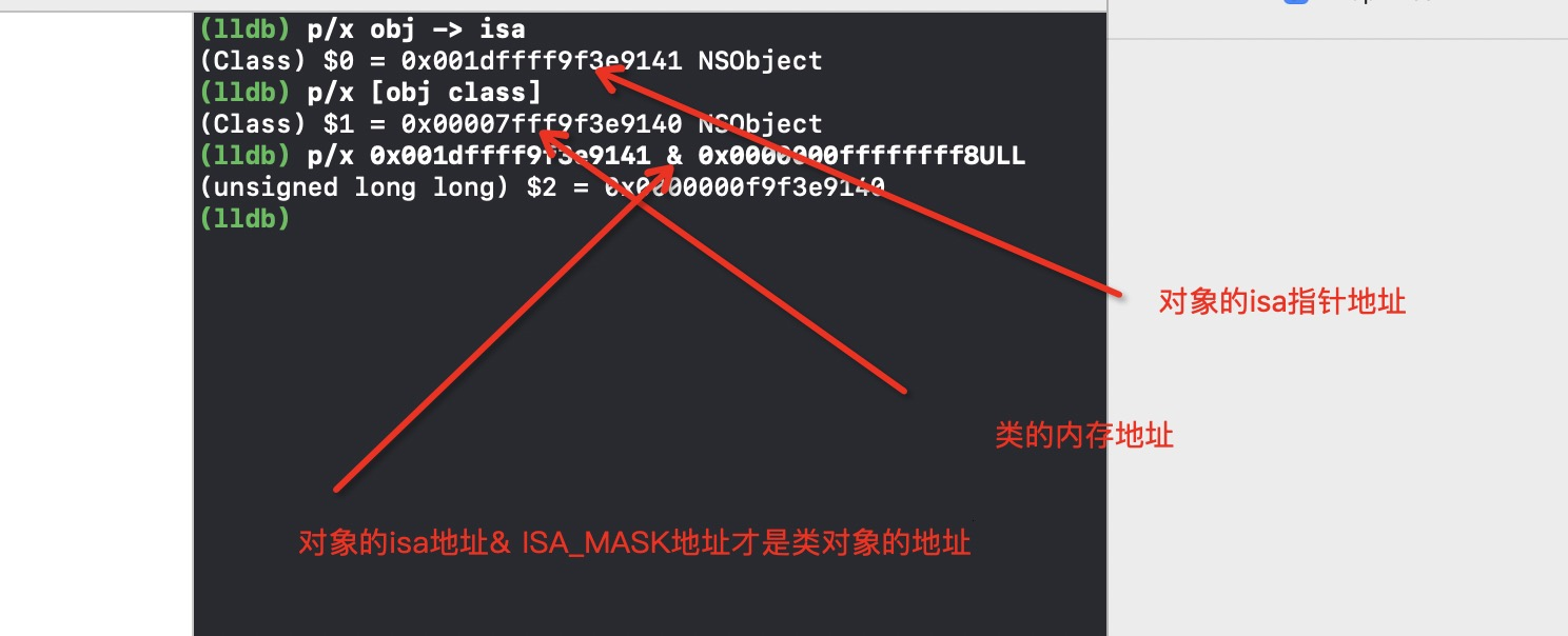 要验证的内容,isa 指针通过& ISA_MASK (33个1)能得到类对象,元类对象的内存地址,说明 isa 的2进制和 原类对象的2进制是一样的。
