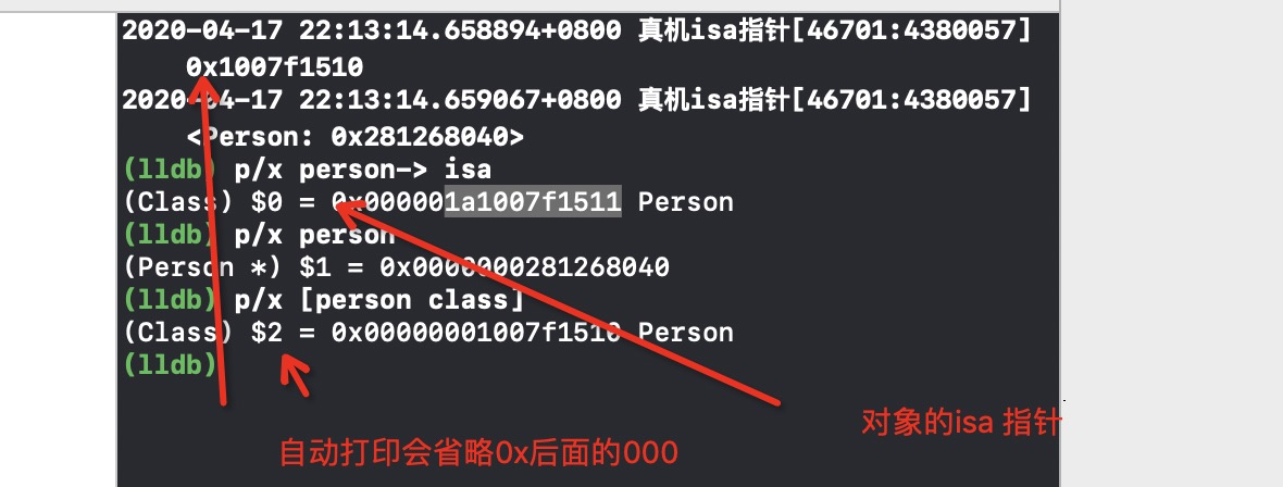 首先打印person类对象的地址,之后通过断点打印一下person对象的isa指针地址。