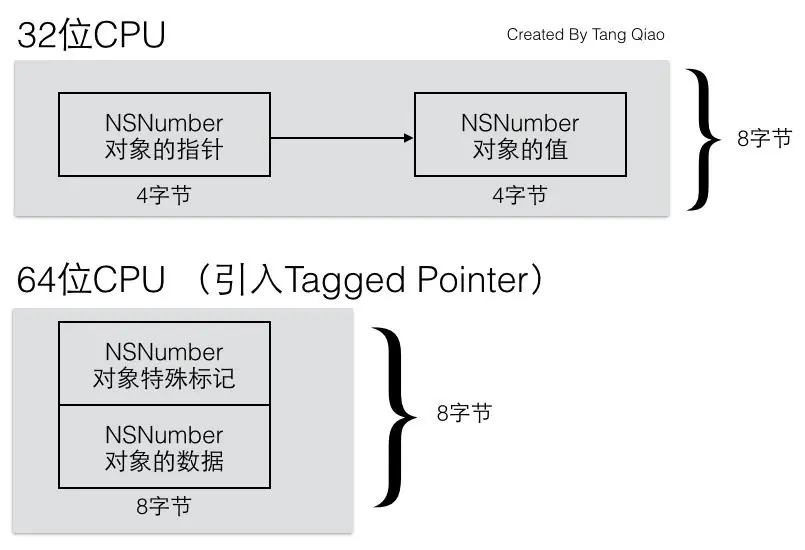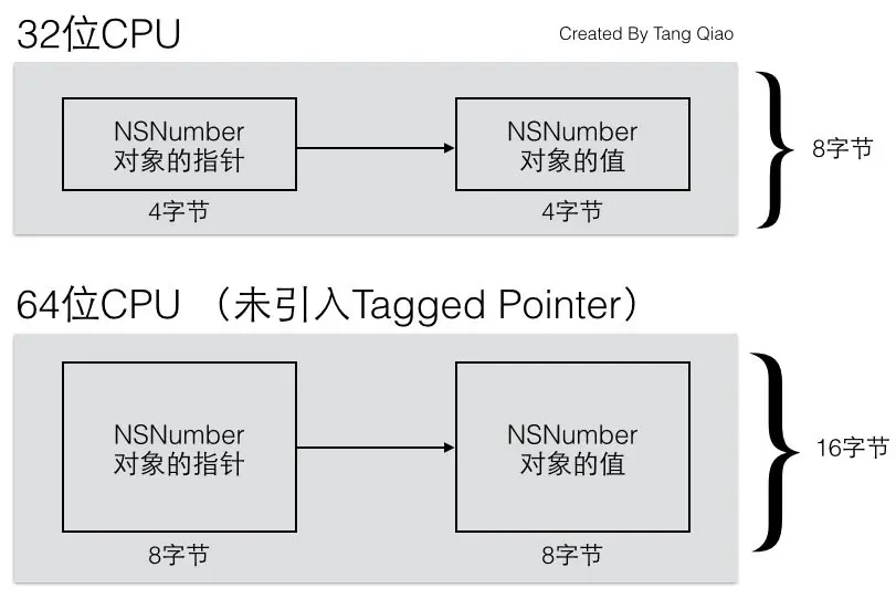 假设我们要存储一个 NSNumber 对象,其值是一个整数。正常情况下,如果这个整数只是一个 NSInteger 的普通变量,那么它所占用的内存是与 CPU 的位数有关,在 32 位 CPU 下占 4 个字节,在 64 位 CPU 下是占 8 个字节的。而指针类型的大小通常也是与 CPU 位数相关,一个指针所占用的内存在 32 位 CPU 下为 4 个字节,在 64 位 CPU 下也是 8 个字节。