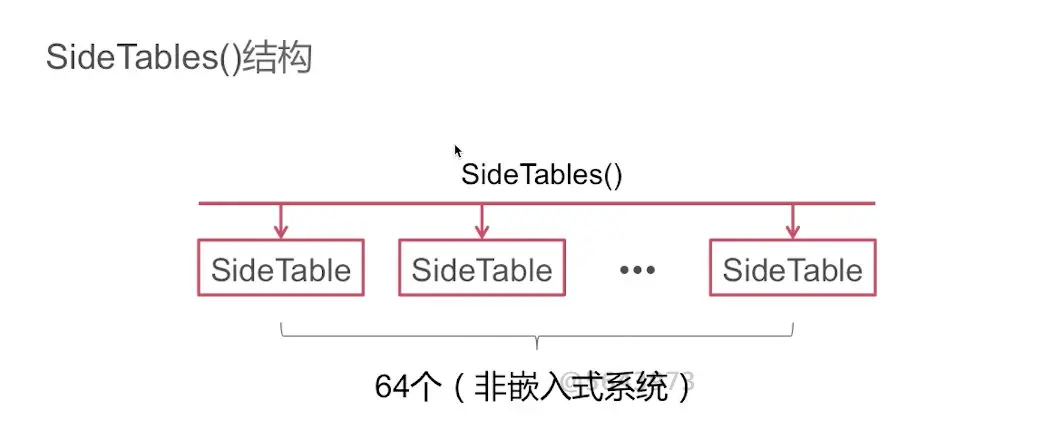 SideTables()实际是一个哈希表,我们可以通过对象指针,找到所对应的引用计数表或弱引用表位于哪个SideTable表中。也就是有多个sideTable表