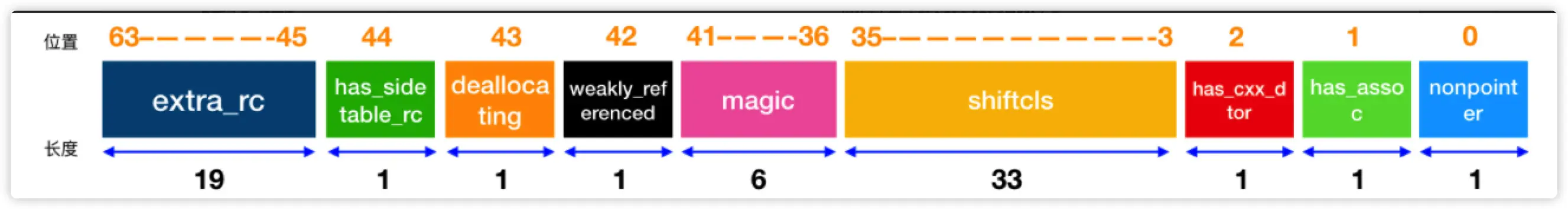 - nonpointer:0,代表普通的指针,存储着Class、Meta-Class对象的内存地址。 1,代表优化过,使用位域存储更多的信息