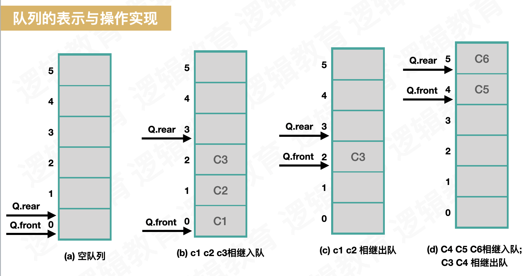 - 当队列中边进边处出时,看队头和队尾指针指向,这个时候表示队列满了,但是图中0-3的空间被浪费了,这就是队列的假溢出问题