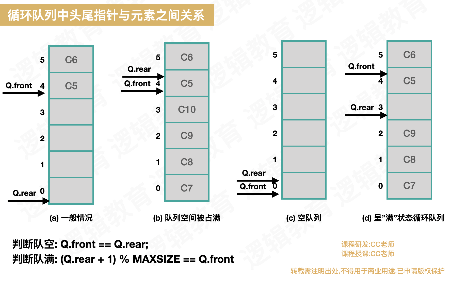 - 当队列被占满时,队头和队尾指针同时指向C5