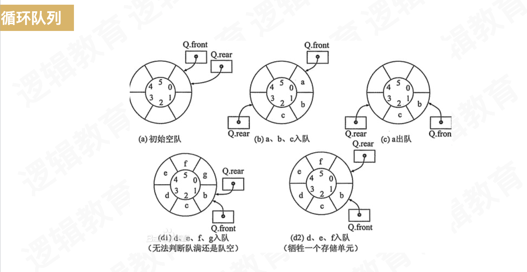 - 思考一个问题:在上面2、3情况时,既然队列满状态和空状态时,队列头、尾指针都指向同一个地址,那怎么判断空状态和满状态呢?