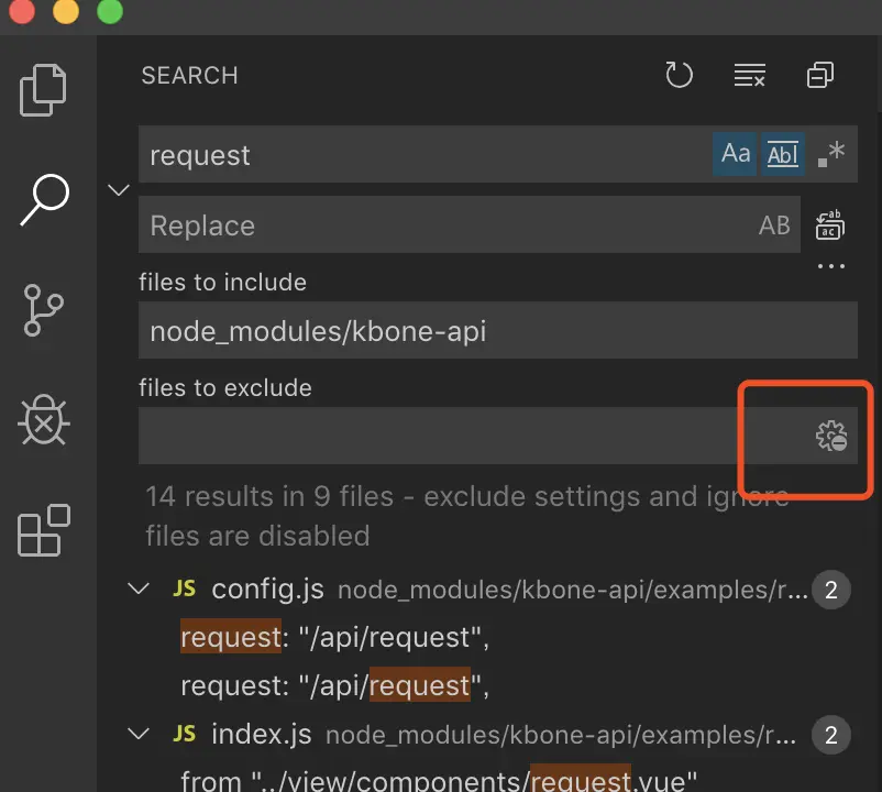 vscode 搜索功能 文本搜索 文件搜索 susy123 2020-04-17 6,107 阅读1分钟 vscode搜索的坑 最近从webstorm切换到vscode,遇到了一个好坑的问题: 明明存在该字符串的文件却搜不到: 经过团队同学提示,试试看去掉路径的一些部分: 能查出一些了,但是还是不全。 再尝试把 files to exclude的按钮关闭,终于都查出来了: 此外经过团队同学提示,搜索文件名用这种方法: 点击到项目内随意文件,然后键盘直接敲index: 光标就停留在搜索的文件名处,悬停,这儿有个筛选按钮,这样就只留下匹配的文件: