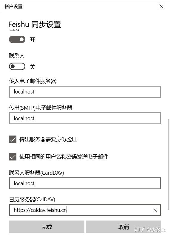 在电子邮件服务器的地方都填入 localhost(目的是为了防止它去连接 iCloud 的服务器),然后在下方的联系人服务器和日历服务器中填上服务提供的服务器地址。填好后点击完成保存即可。