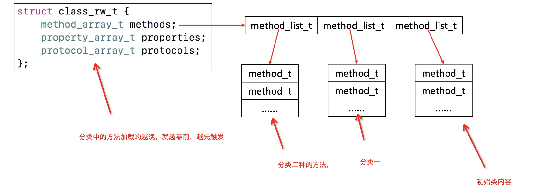 class_rw_t里面的methods、properties、protocols是二维数组,是可读可写的,其中包含了类的初始内容以及分类的内容。