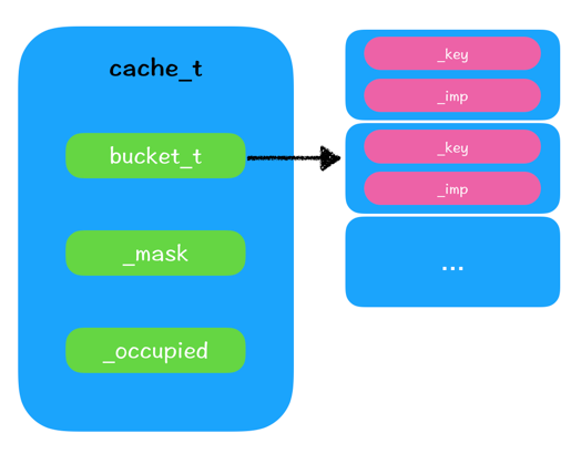 bucket_t中存储着SEL和_imp,通过key->value的形式,以SEL为key,函数实现的内存地址 _imp为value来存储方法。