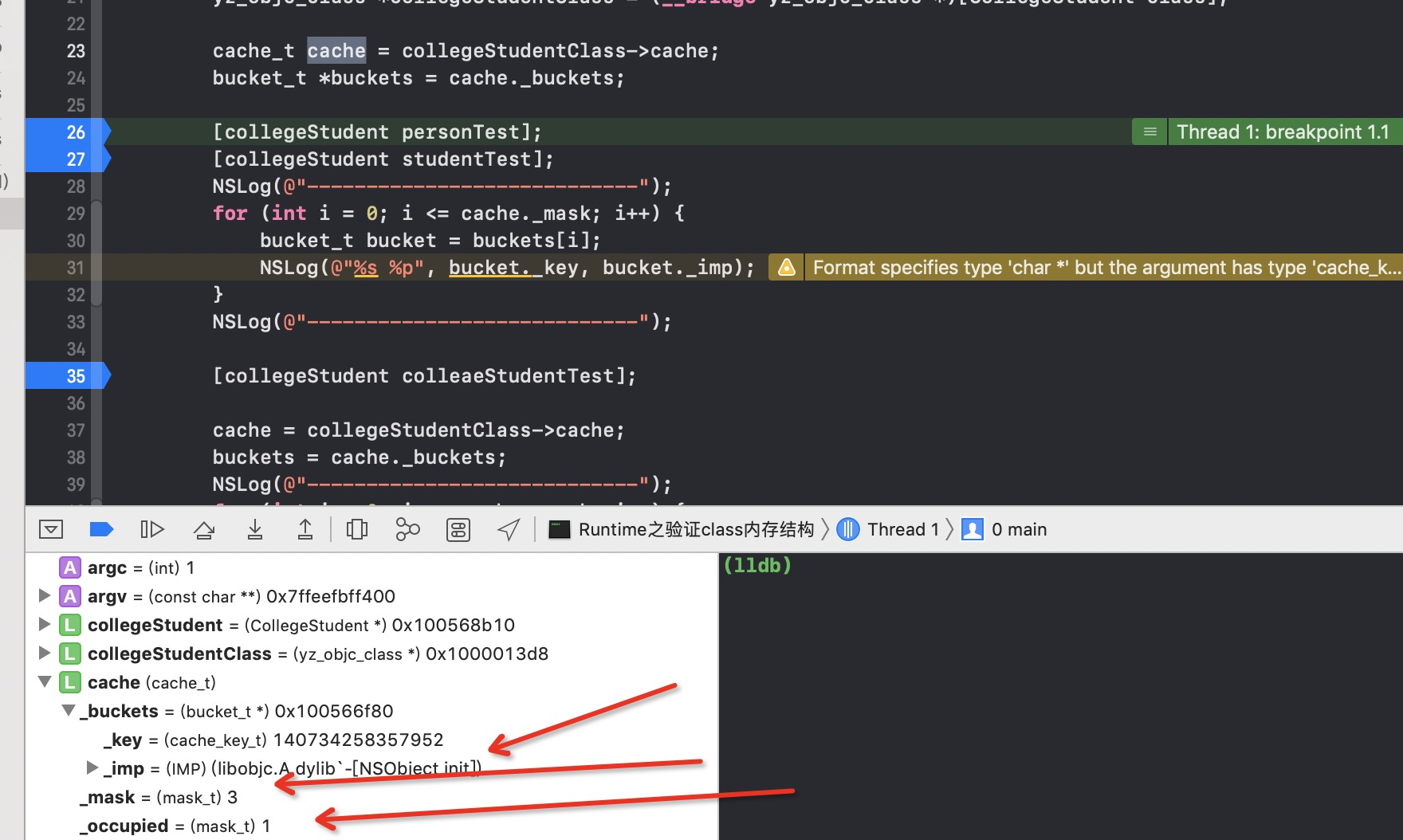 从上图中可以发现,personTest方法调用之前,cache中仅仅存储了init方法,上图中可以看出init方法恰好存储在下标为0的位置因此我们可以看到,_mask的值为3验证我们上述源码中提到的散列表第一次存储时会分配4个内存空间,_occupied的值为1证明此时_buckets中仅仅存储了一个方法。