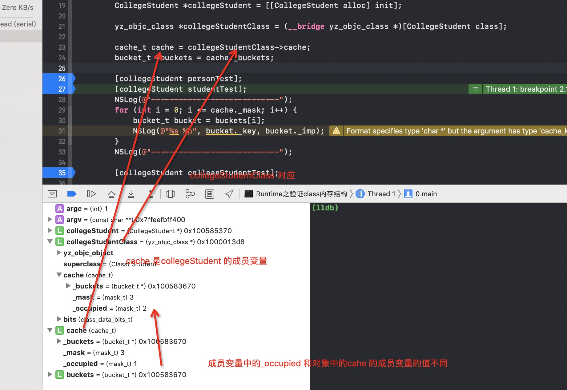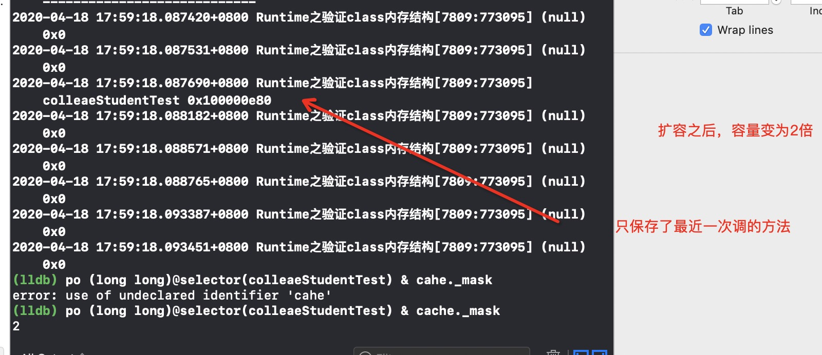 可以看出上图中_bucket散列表扩容之后仅仅存储了colleaeStudentTest方法,并且上图中打印SEL & _mask 位运算得出下标的值确实是_bucket列表中colleaeStudentTest方法存储的位置。 至此已经对Class的结构及方法缓存的过程有了新的认知,apple通过散列表的形式对方法进行缓存,以少量的空间节省了大量查找方法的时间。