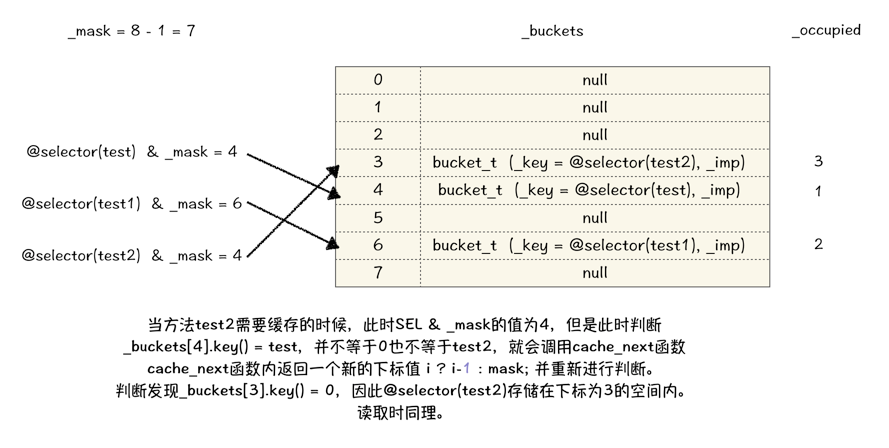 当第一次使用方法时,消息机制通过isa找到方法之后,会对方法以SEL为keyIMP为value的方式缓存在cache的_buckets中,当第一次存储的时候,会创建具有4个空间的散列表,并将_mask的值置为散列表的长度减一,之后通过SEL & mask计算出方法存储的下标值,并将方法存储在散列表中。举个例子,如果计算出下标值为3,那么就将方法直接存储在下标为3的空间中,前面的空间会留空。 当散列表中存储的方法占据散列表长度超过3/4的时候,散列表会进行扩容操作,将创建一个新的散列表并且空间扩容至原来空间的两倍,并重置_mask的值,最后释放旧的散列表,此时再有方法要进行缓存的话,就需要重新通过SEL & mask计算出下标值之后在按照下标进行存储了。 如果一个类中方法很多,其中很可能会出现多个方法的SEL & mask得到的值为同一个下标值,那么会调用cache_next函数往下标值-1位去进行存储,如果下标值-1位空间中有存储方法,并且key不与要存储的key相同,那么再到前面一位进行比较,直到找到一位空间没有存储方法或者key与要存储的key相同为止,如果到下标0的话就会到下标为_mask的空间也就是最大空间处进行比较。 当要查找方法时,并不需要遍历散列表,同样通过SEL & mask计算出下标值,直接去下标值的空间取值即可,同上,如果下标值中存储的key与要查找的key不相同,就去前面一位查找。这样虽然占用了少量控件,但是大大节省了时间,也就是说其实apple是使用空间换取了存取的时间。