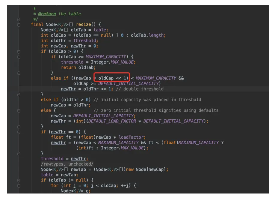 达到你定义的初始化值的0.75倍时候就会扩容到原来的2倍。有的人又要问了为什么是2倍,不是0.5,1.5之类的呢?源码中给了一个方法:根据传过来的定义的map大小来进行或运算之后得到扩容之后的2倍。