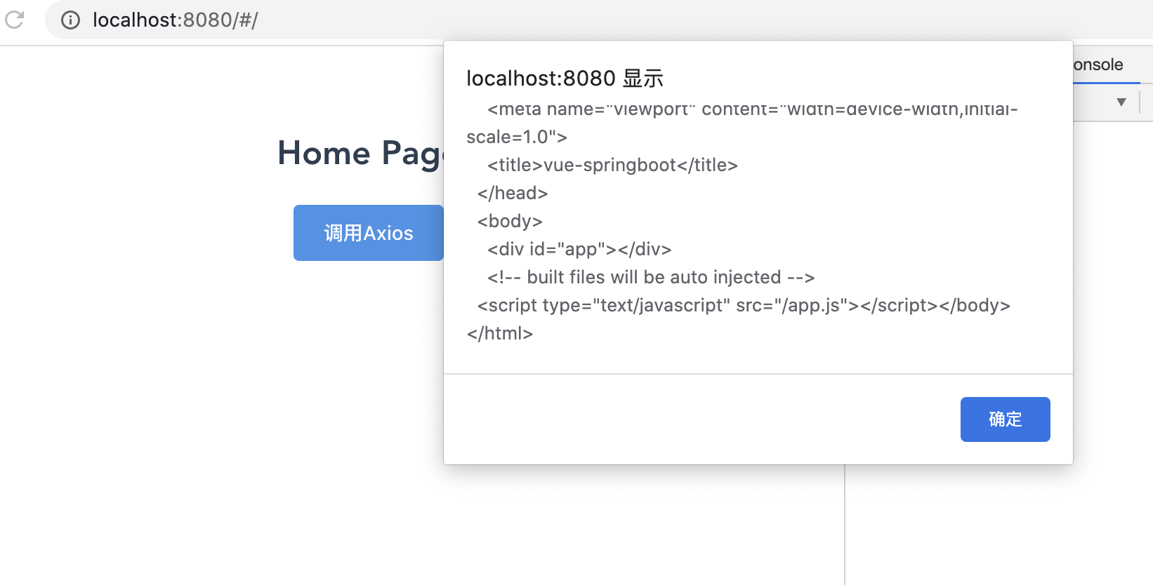 第五章 配置axios 前端研究猿 2020-04-18 394 阅读1分钟 一、安装axios cnpm i axios --save 二、打开Home.vue 在script中加入 import axios from 'axios' methods:{ testAxios(){ axios.get('http://localhost:8080').then(res => { alert(res.data) }) } } 三、效果展示