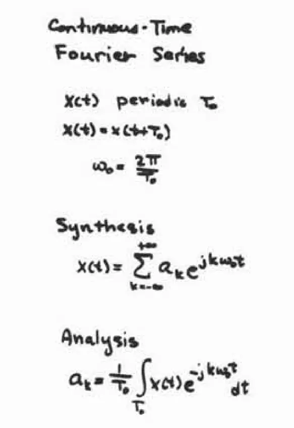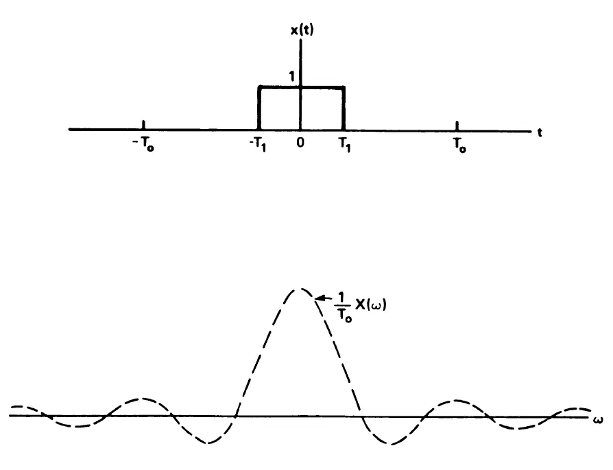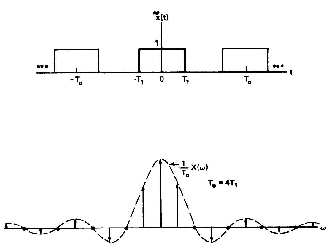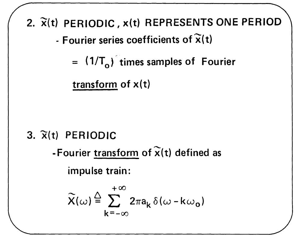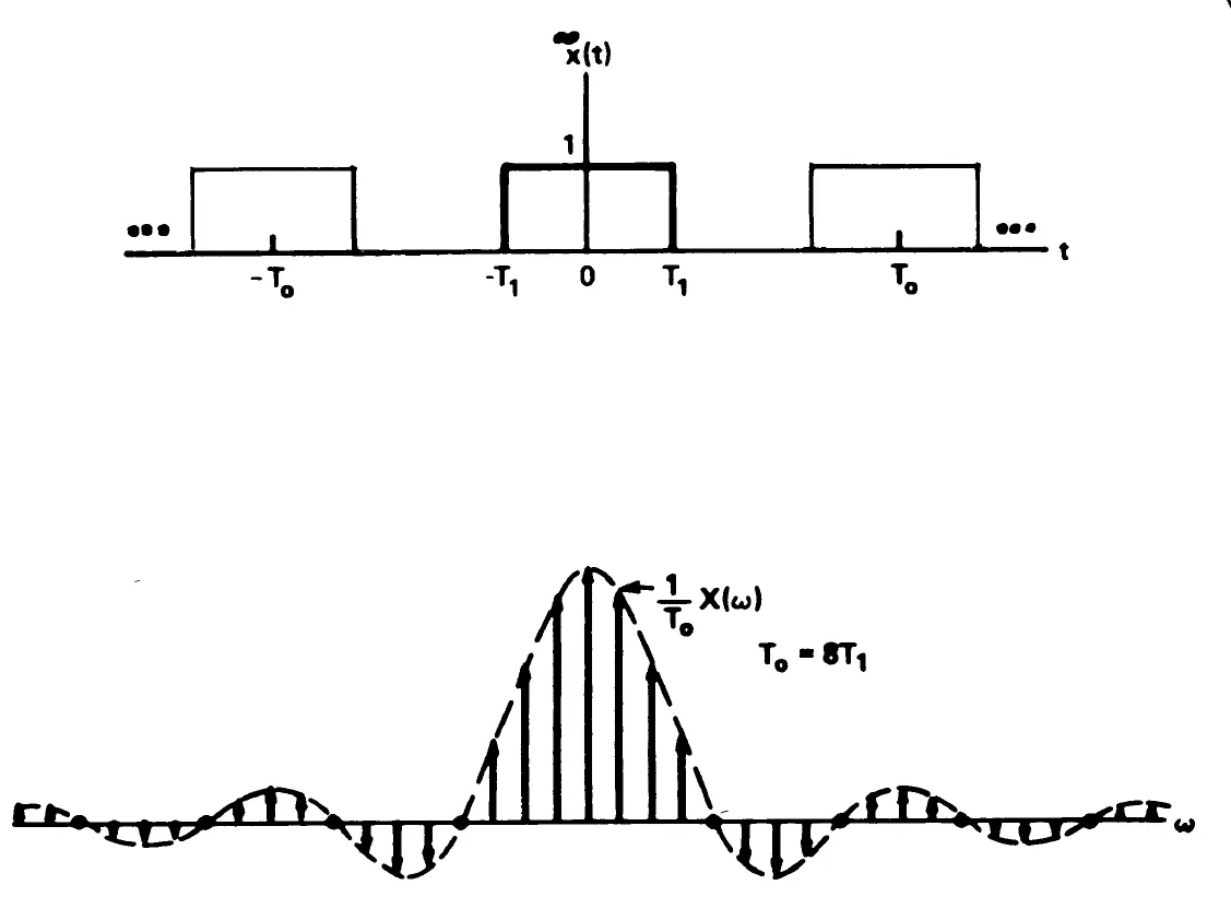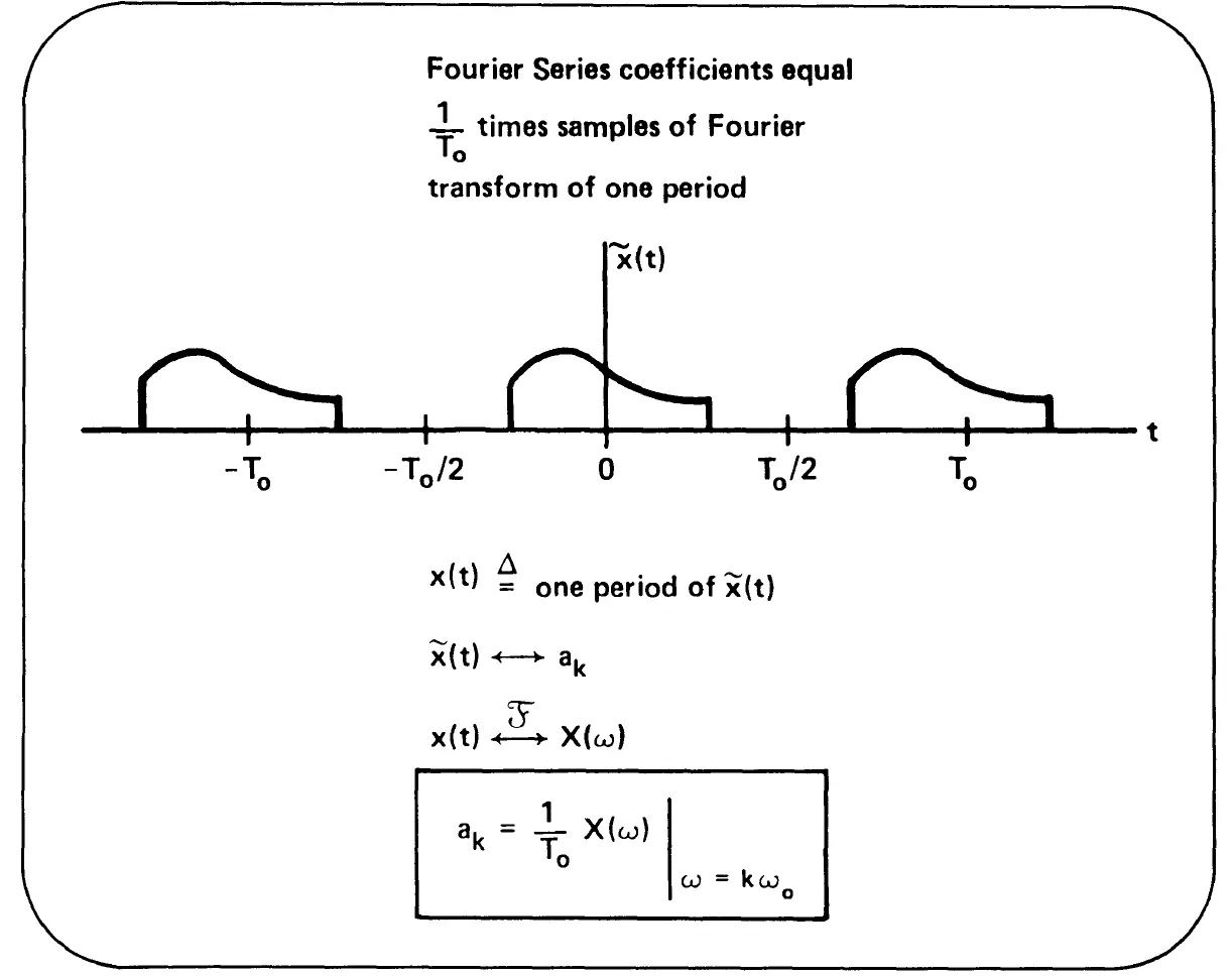 周期信号的傅里叶级数系数ak就是对应一个周期内非周期信号的傅里叶变换的采样,并且随着周期的变大,采样频率变小,当周期→∞,周期信号就→非周期信号。