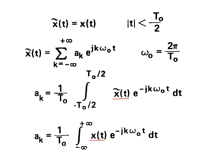 傅里叶级数的系数ak等式右边为周期信号在一个周期内的积分,相当于非周期信号在整个坐标轴上的积分(仅有一个周期)